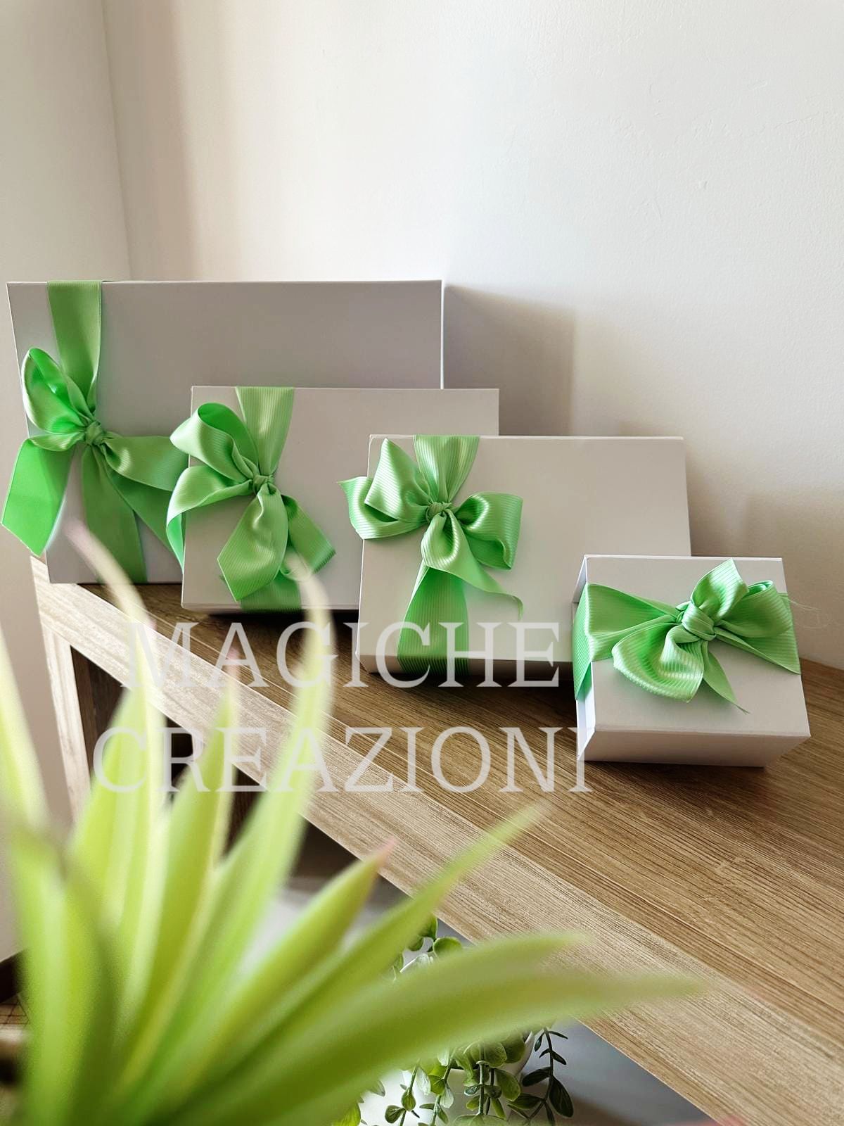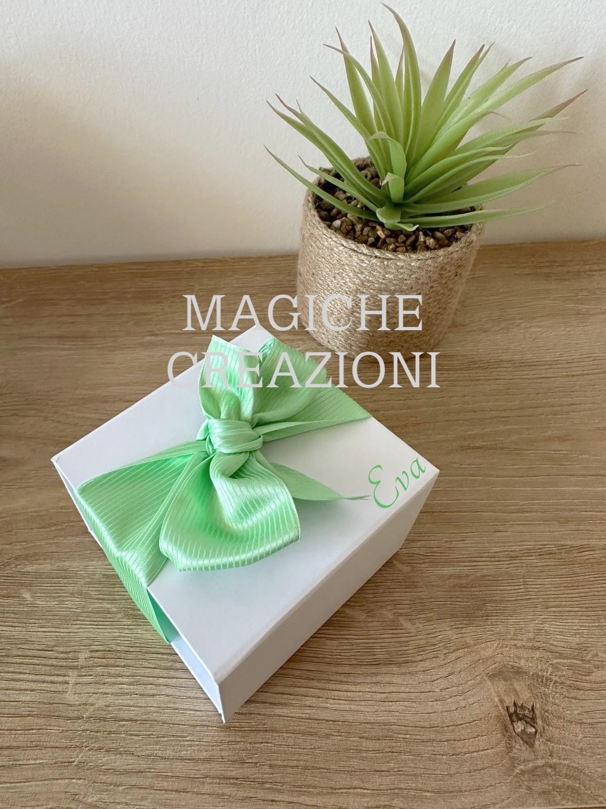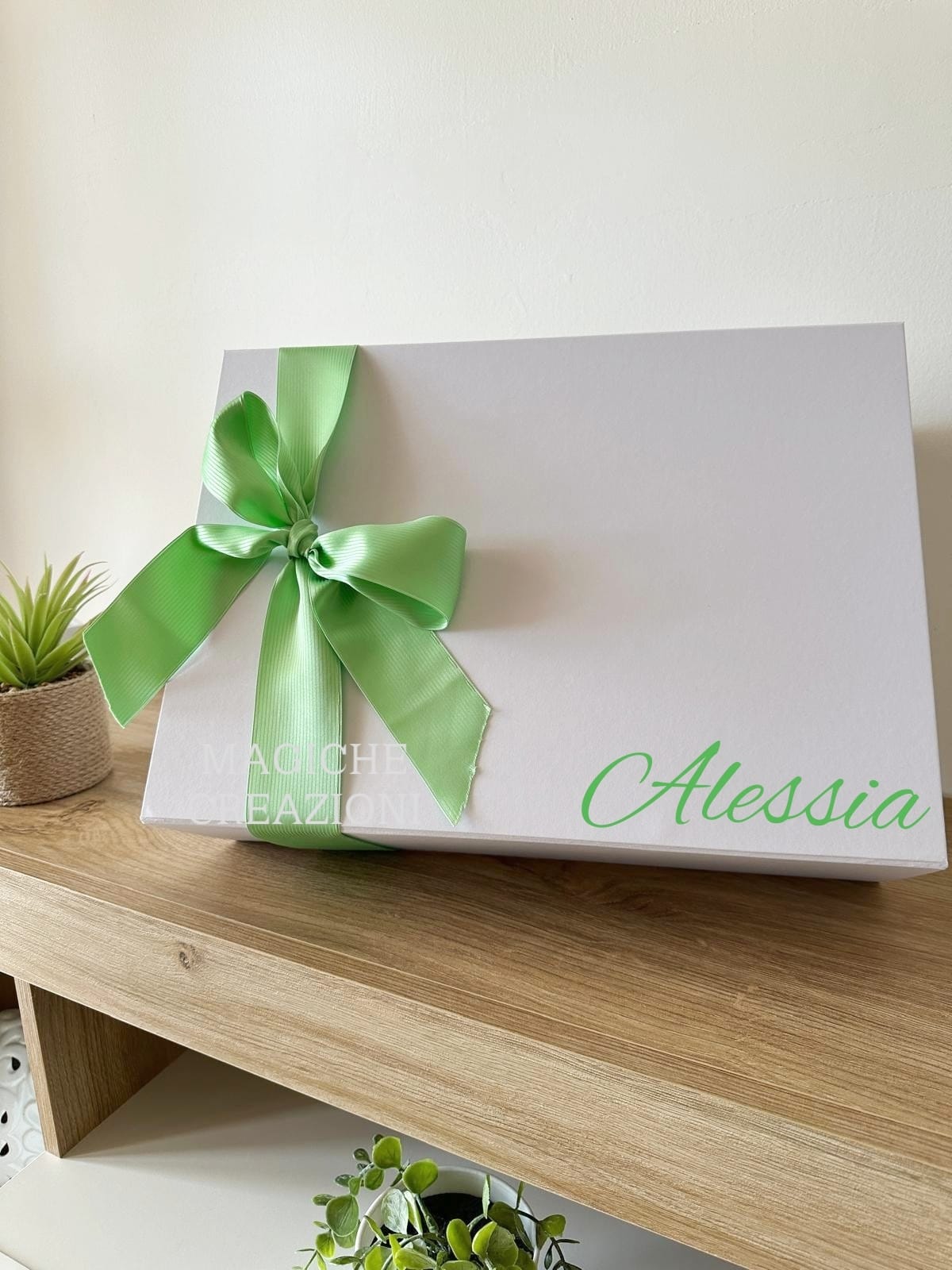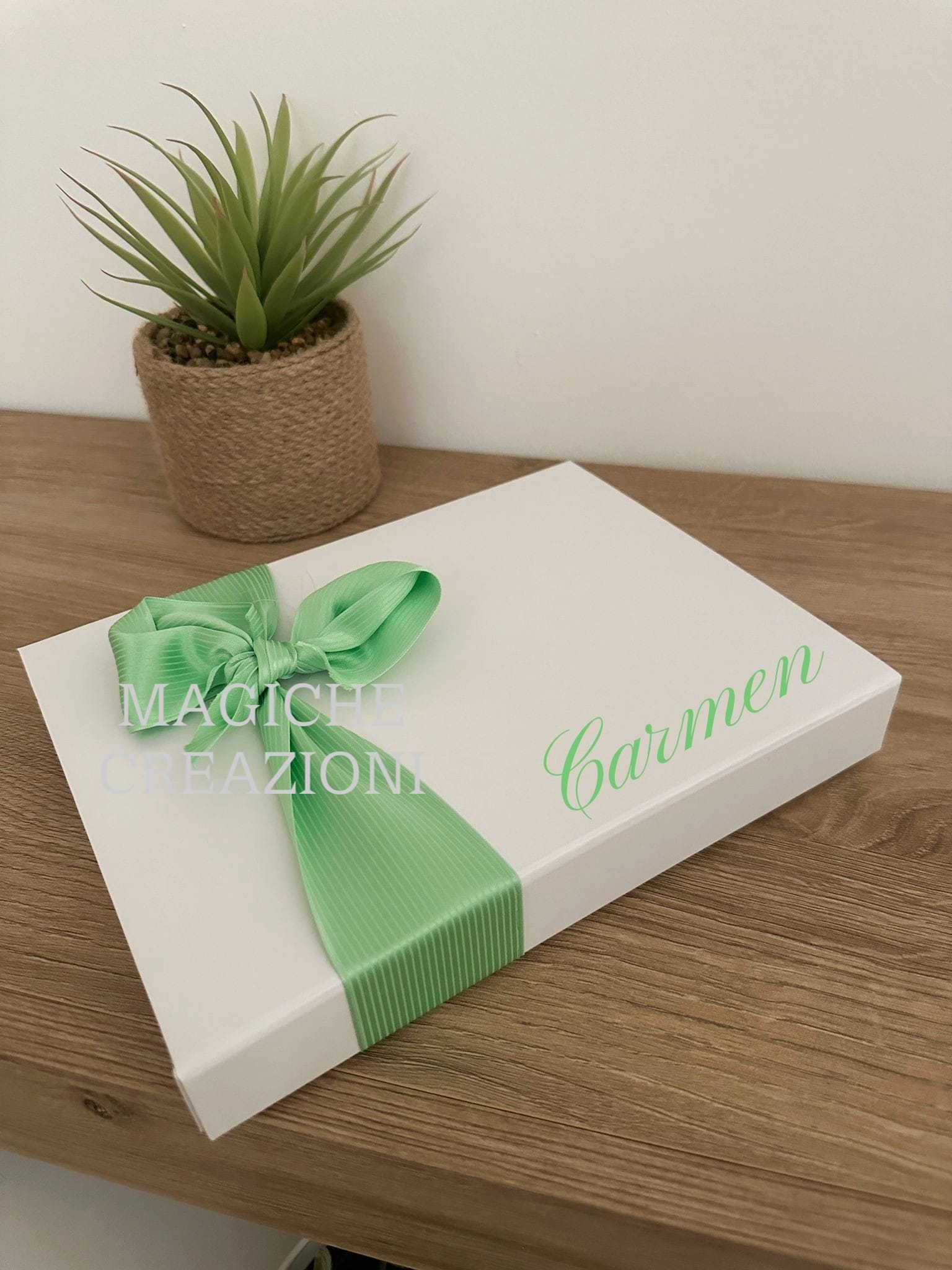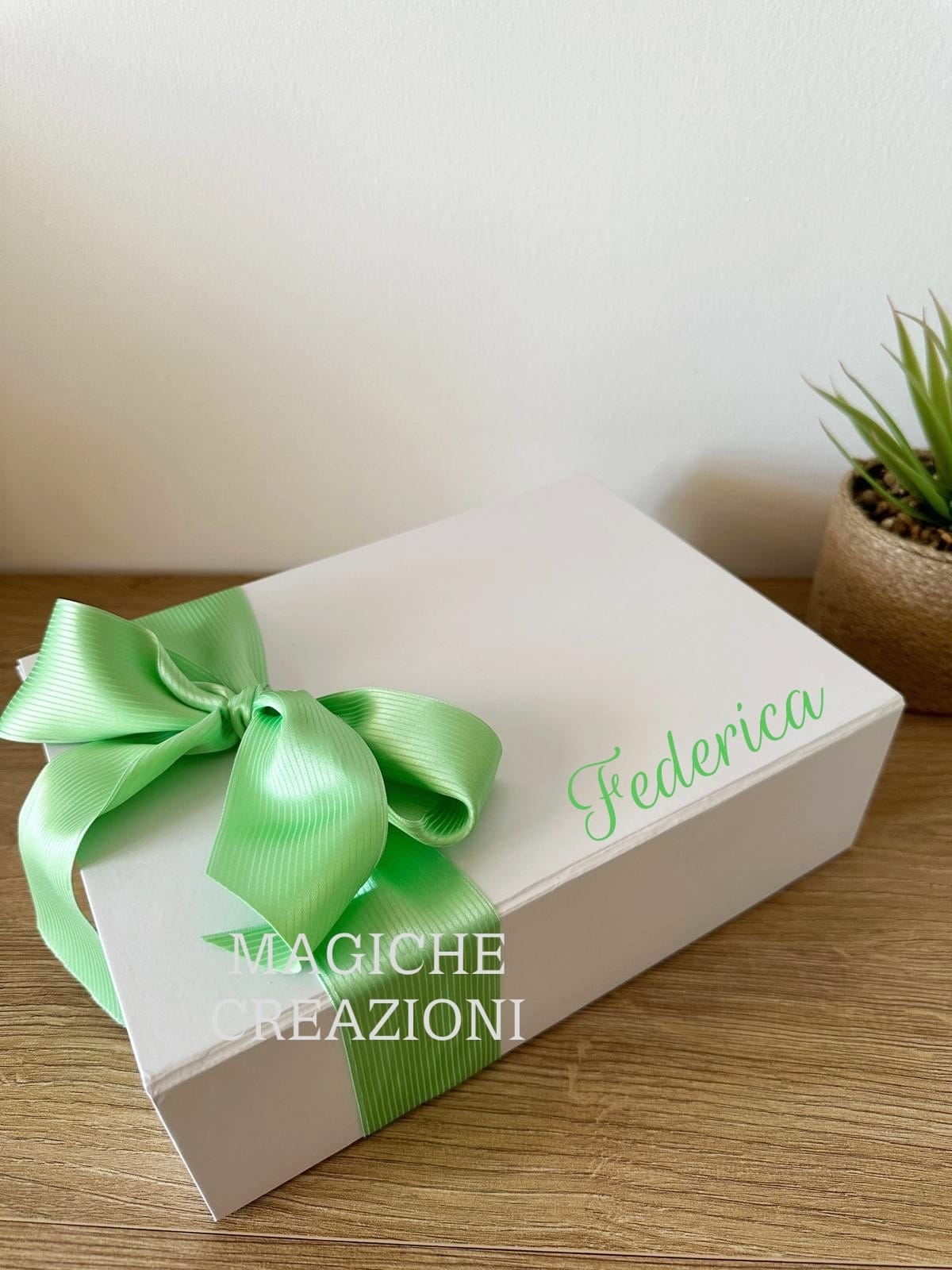 La scatola verrà spedita con la personalizzazione del nome e/o del testo interno se lo si desidera, e con l'aggiunta del fiocco nel colore prescelto.