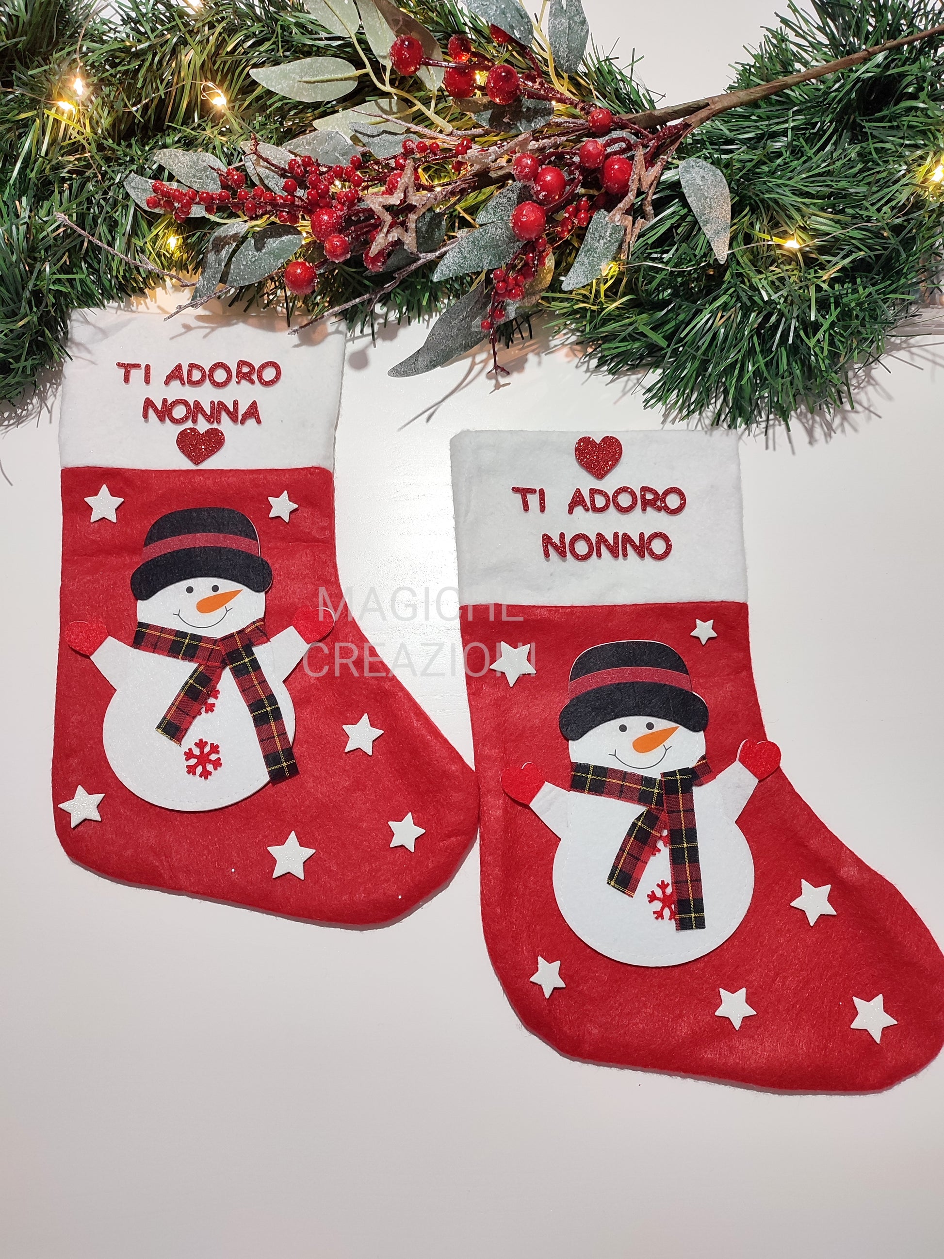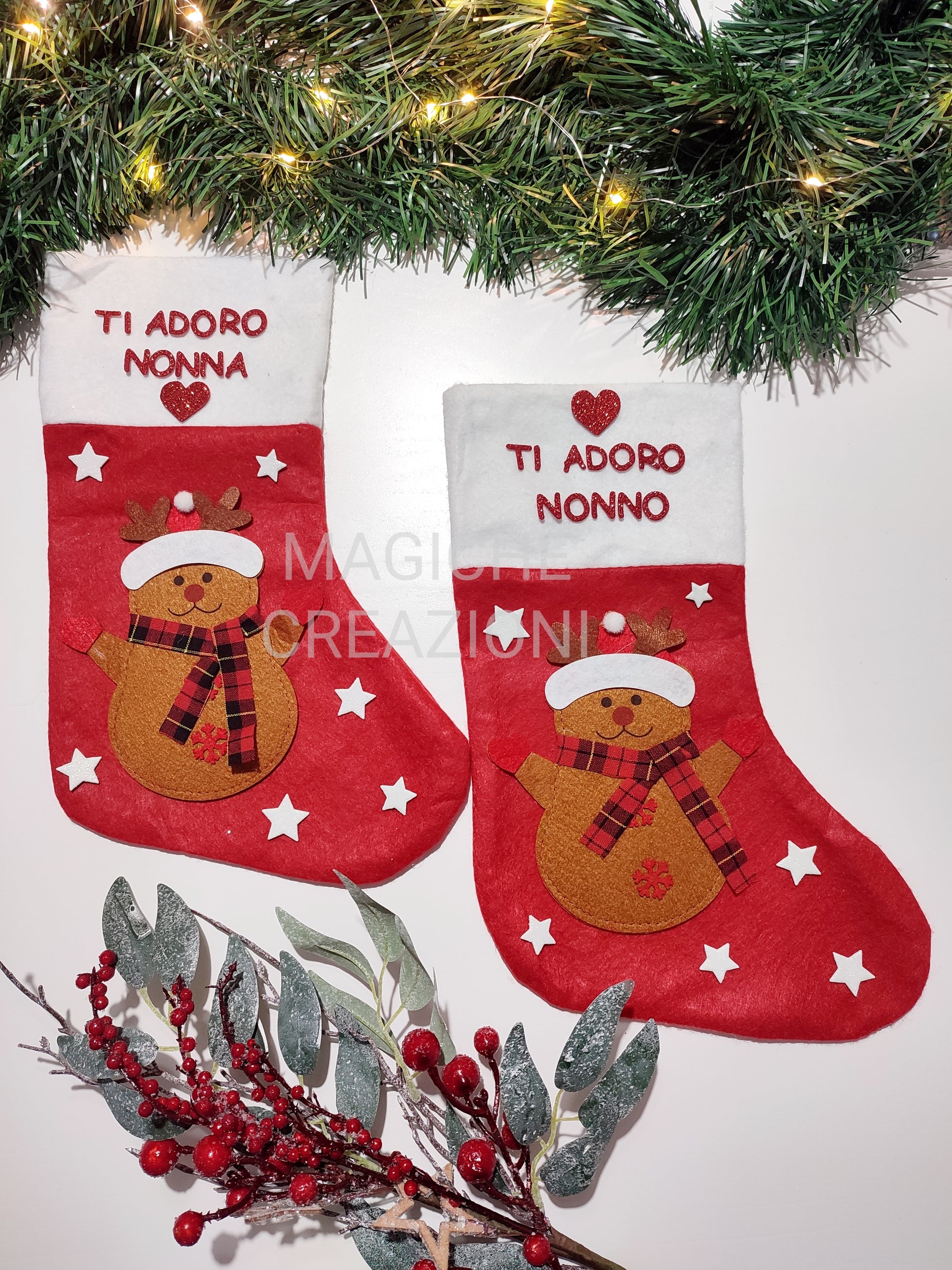 Calza della Befana in tessuto, con personaggio a scelta in feltro e decorazioni in gomma crepla glitterata.