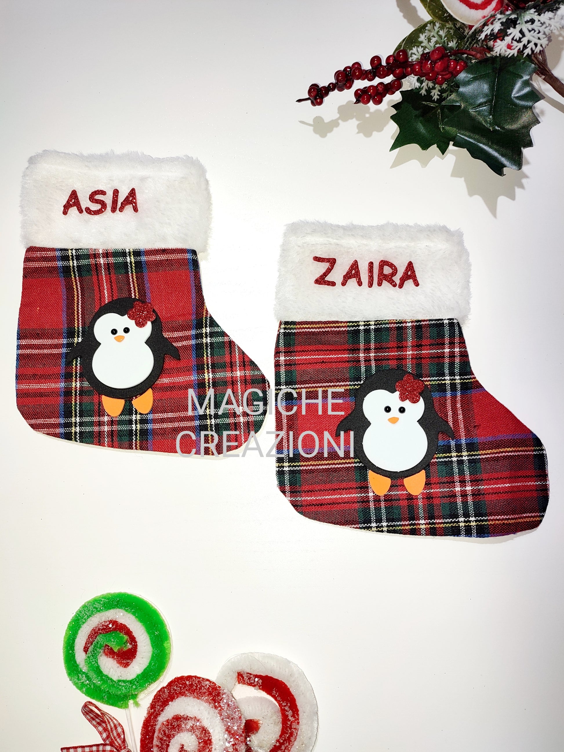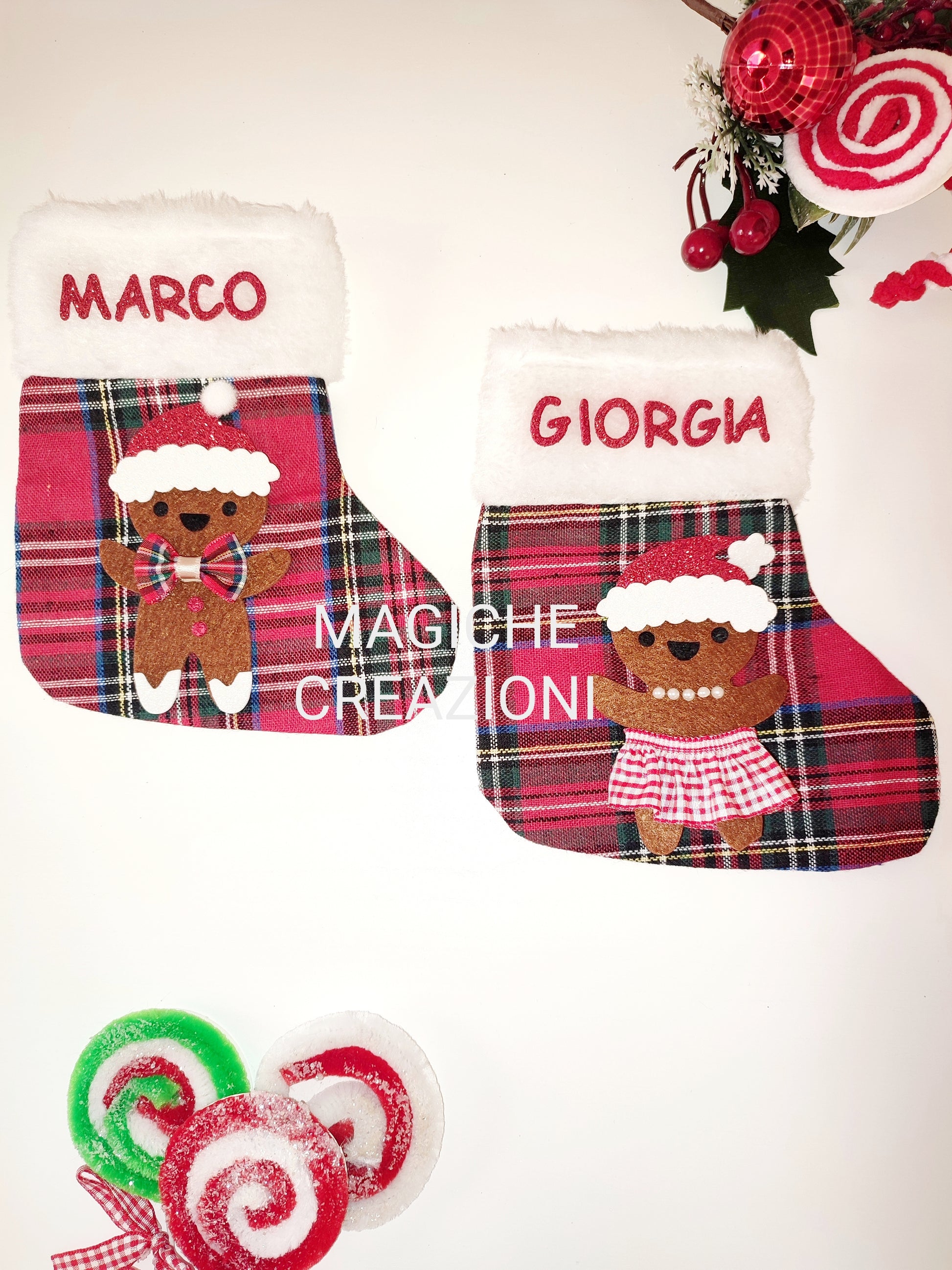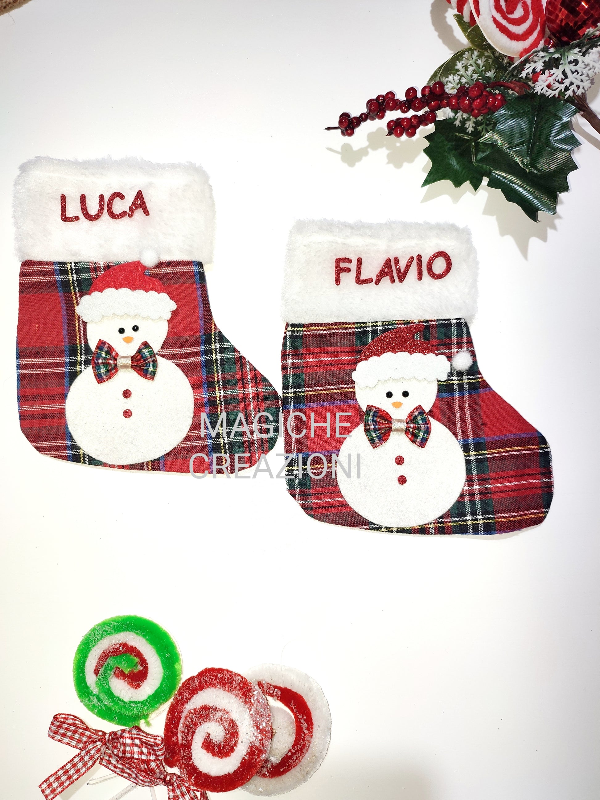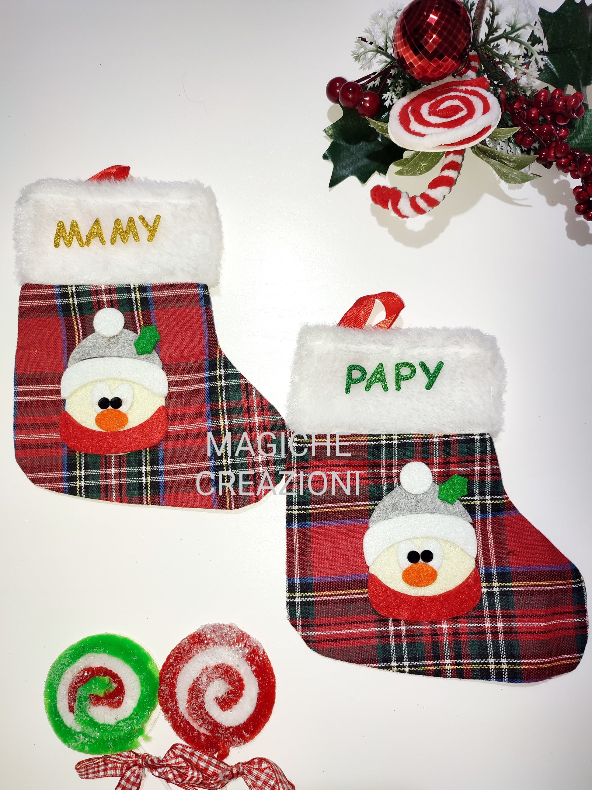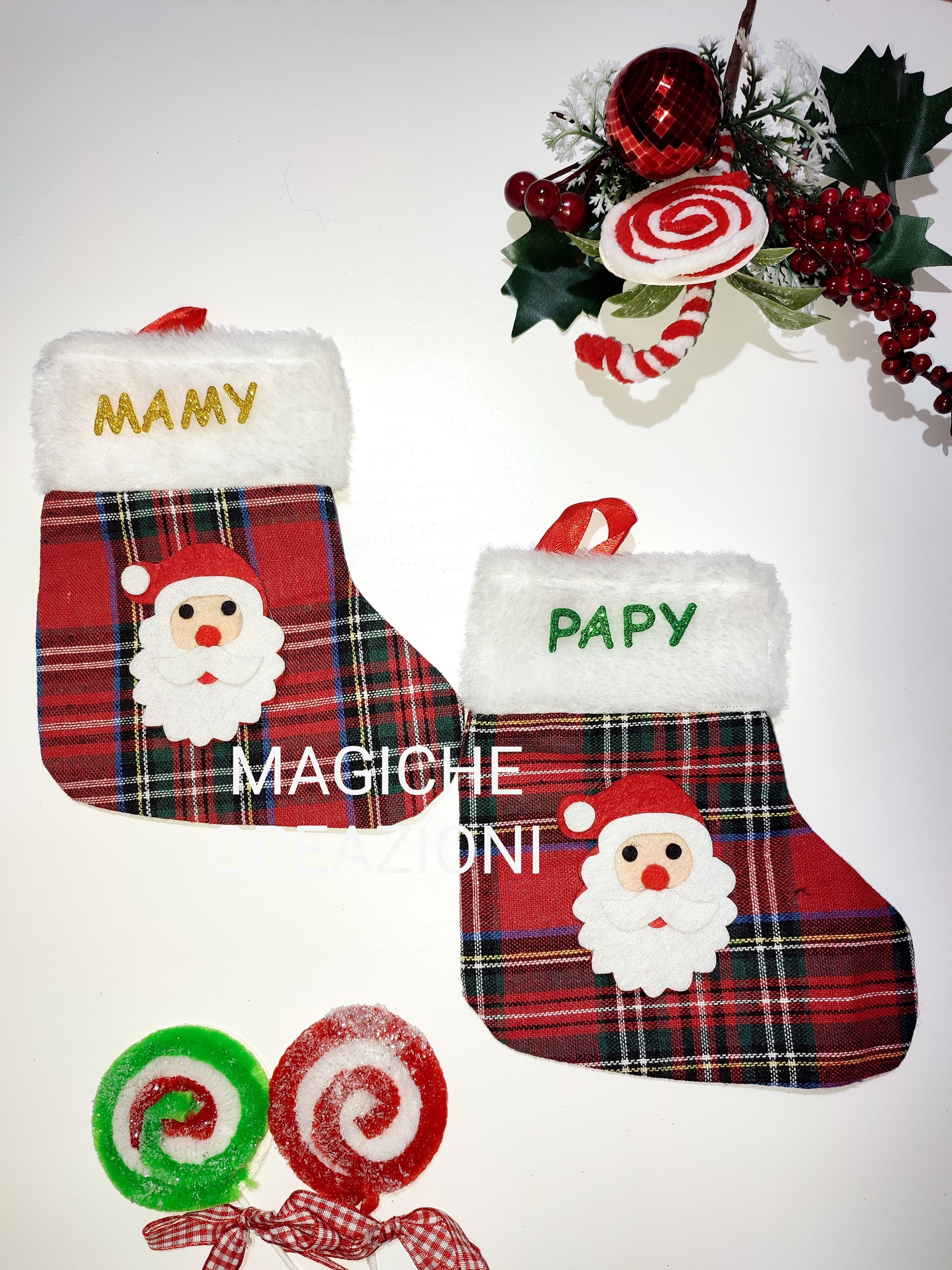 Calza della Befana in tessuto tartan , con personaggio a scelta in feltro e decorazioni in gomma crepla glitterata.