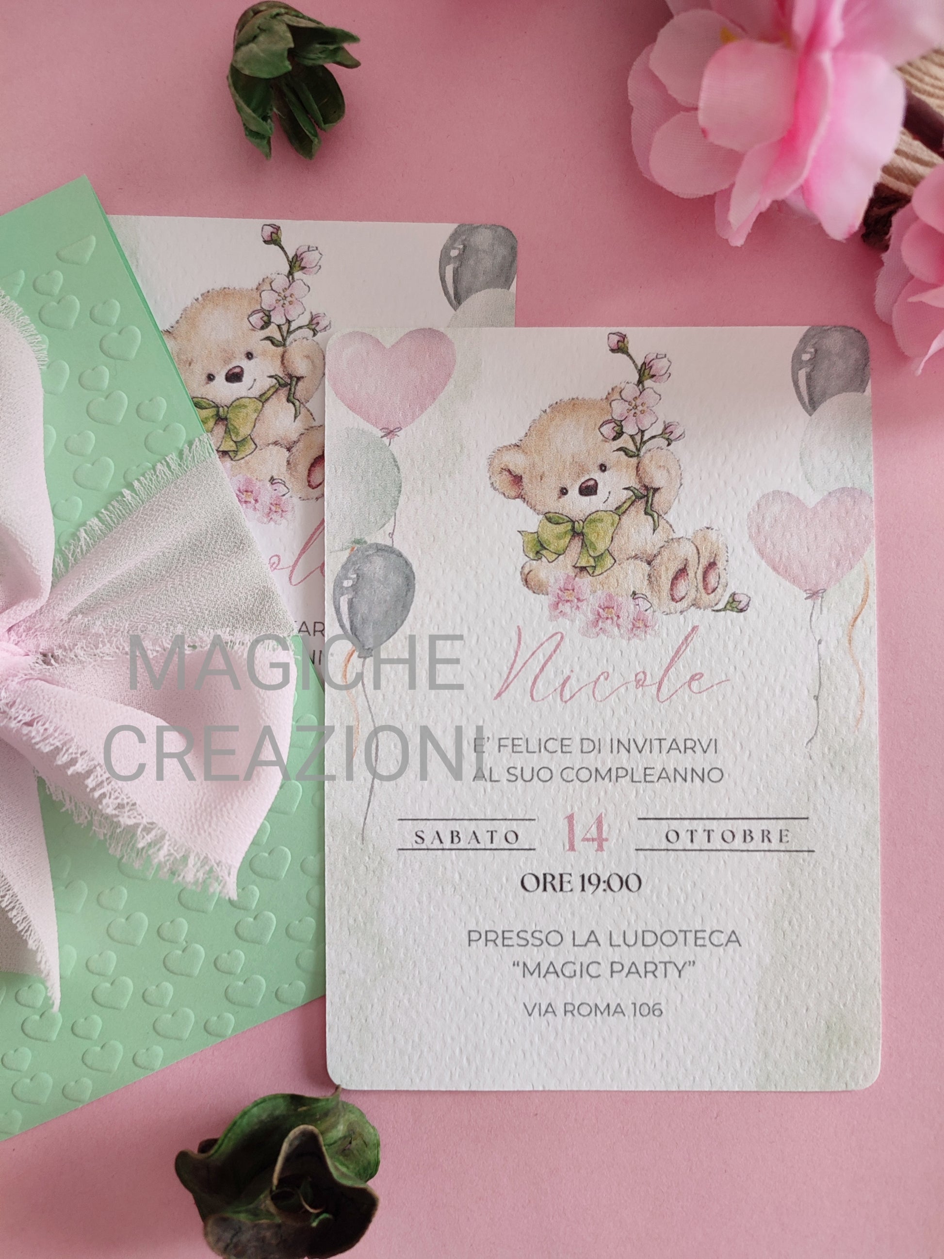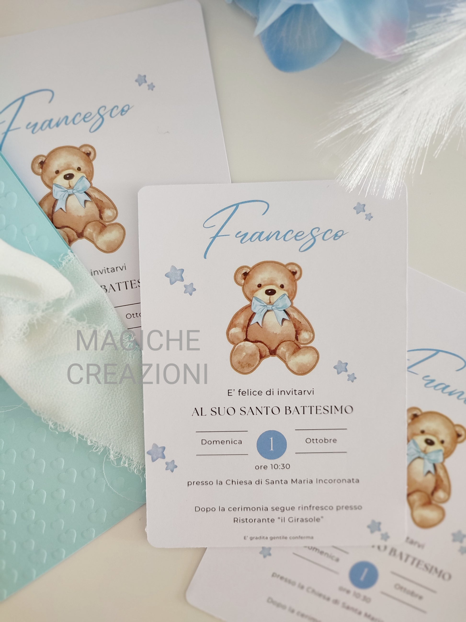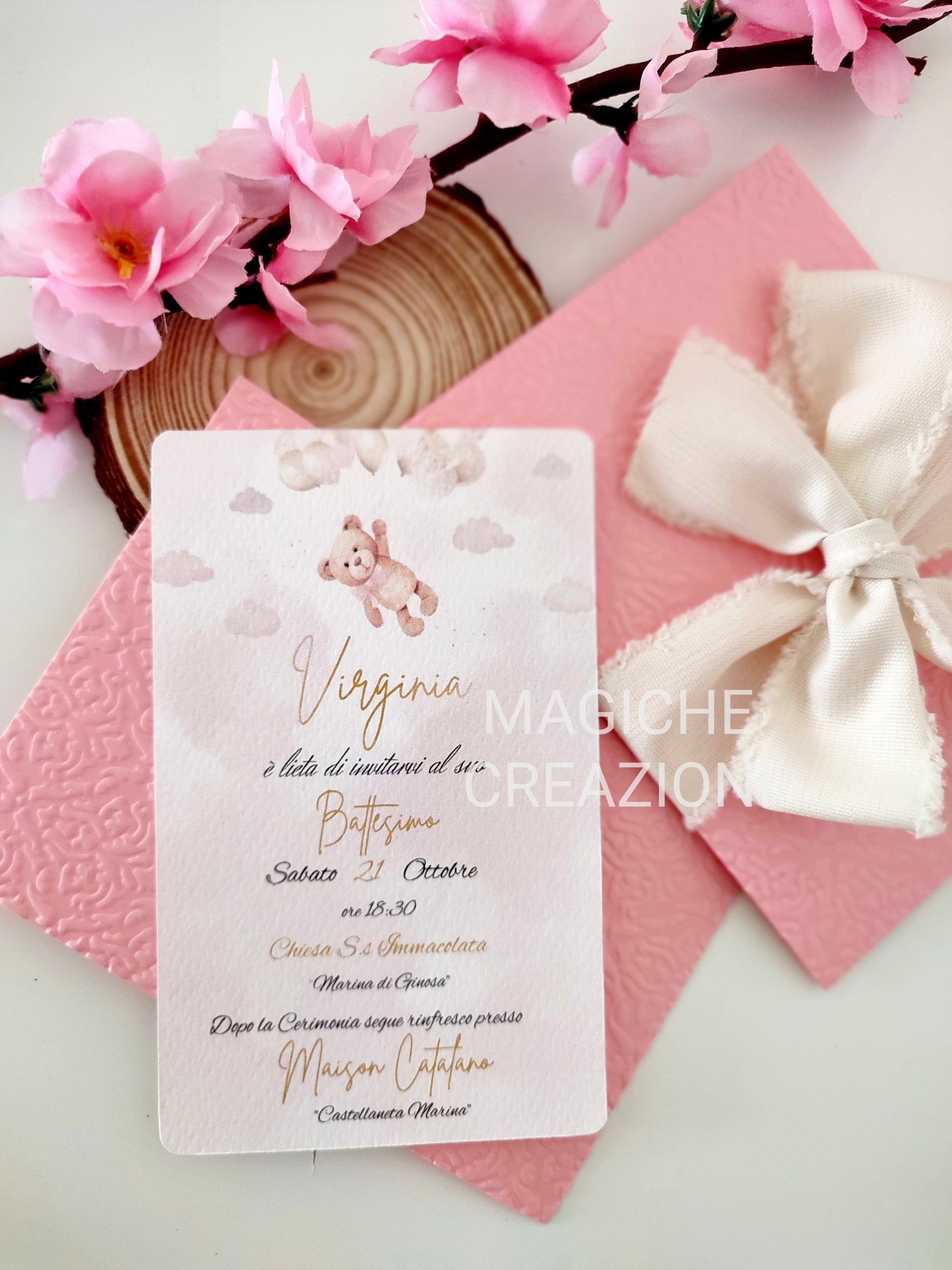 Ogni invito cartaceo è corredato da Cartoncino damascato e nastro con fiocchetto in raso, in chiffon, o in cordoncino nella scelta del colore che si preferisce.